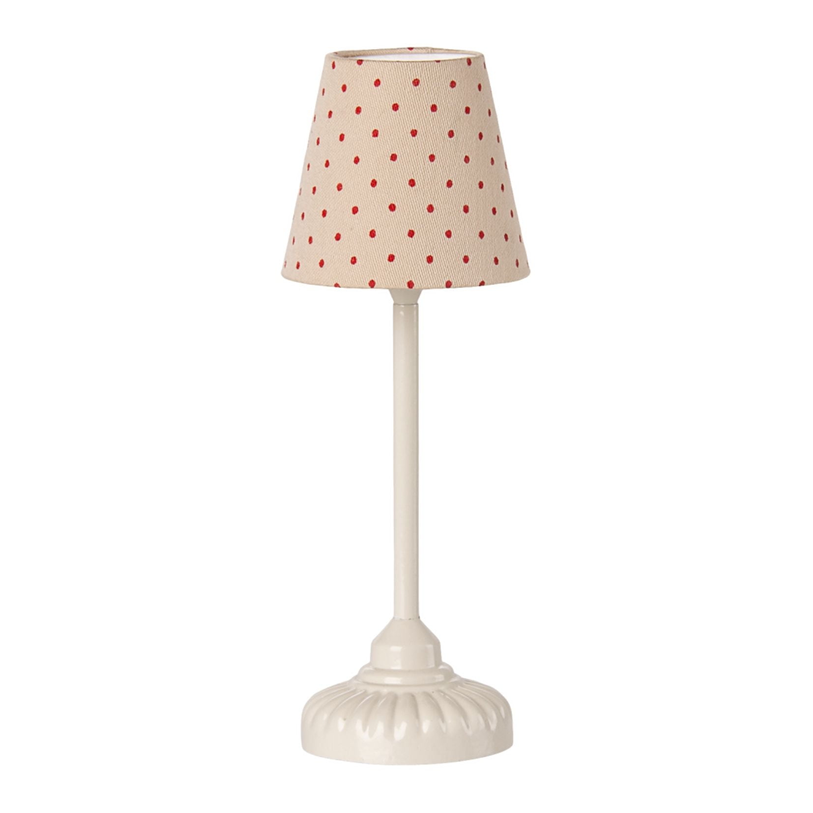 Lampička má podstavec z kovu, je proto těžká a dobře stabilní. Stínítko je naopak ušité z bavlny a na svím krémovém podkladu nechává vyniknout drobným červeným puntíkům. výška 14 cm / průměr 4,5 cm Vyrobeno z kovu, plastu a bavlny.