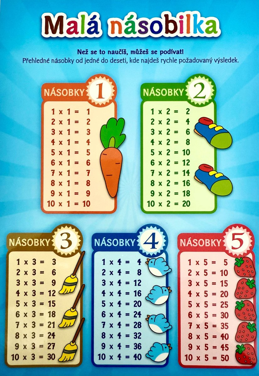 S tímto přehledem malé násobilky ( násobky 1- 10 ) zvládneš násobení na jedničku. V každém rámečku nalezneš rychle správný výsledek. Příjemný A5 formát vhodný do sešitu.