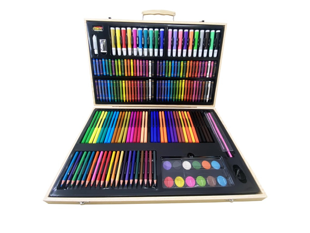 Malířský kufřík dřevěný představuje rozsáhlou sadu kreativních pomůcek určených pro všechny, kdo rádi tvoří a experimentují s barvami. Tento kufřík je vyroben z přírodního dřeva s hladkým povrchem a praktickou rukojetí, což usnadňuje jeho přenášení a skladování. Po otevření kufříku se uživateli nabízí perfektně uspořádaný prostor s jednotlivými oddíly, kde je vše přehledně rozděleno a snadno dostupné. Uvnitř kufříku najdete celkem 180 kusů výtvarných potřeb, které zahrnují širokou škálu barevných nástrojů. Sada obsahuje 40 olejových pastelek, 40 barevných pastelek, 20 akvarelových fixů, 20 barevných tužek a 36 akvarelových per. Dále je zde 12 akvarelových barev, které lze použít s přiloženým štětcem a paletou pro míchání odstínů. Pro doplnění výbavy je součástí i tužka, guma, ořezávátko, pravítko, lepidlo a pět klipů, které pomohou udržet vytvořené výtvory pohromadě. Design kufříku je nejen funkční, ale i estetický, s barevným potiskem na víku znázorňujícím pestré barevné skvrny, které evokují kreativitu a hravost. Díky této sadě mohou děti i dospělí rozvíjet své výtvarné dovednosti doma, ve škole nebo na cestách. Kompletnost a pestrá paleta nástrojů dělají z tohoto dřevěného kufříku ideální dárek pro všechny milovníky malování a kreslení, kteří hledají vše potřebné v jednom praktickém balení.