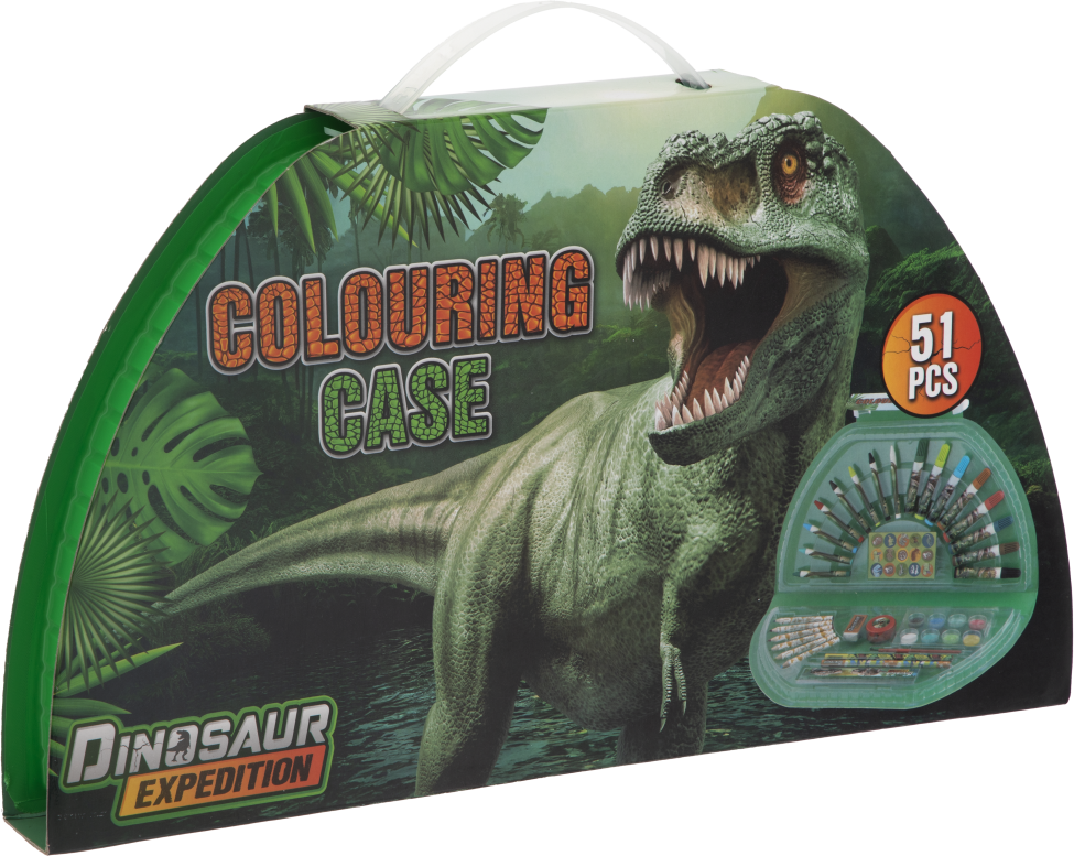 Malovací kufřík půlkruhový Dino – obsahuje vše co potřebujete pro malování, v praktickém uzavíratelném kufříky. Obsahuje 51 ks – fixy, voskovky, vodovky, ořezávátko, gumu, pastelky, pravítko, obyčejné tužky, štětec a samolepky dinosaurů.