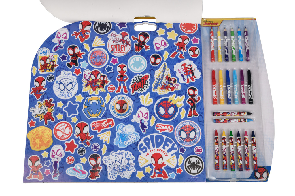 Malovací sada 5v1 Spidy obsahuje – 8 ks voskovek, 6 ks fixů, 6 ks pastelek, aršík s 84 samolepkami Spidy, 15 šablon a čisté papíry.