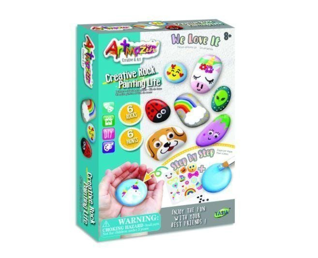 Vytvořte si barevný a veselý kamínek. Můžete malovat, nalepovat a ozdobit dle vlastních představ nebo se inspirovat se motivy na krabici. Vyberte si oblázek, fixem si nakreslete, co Vás napadne a můžete začít s barvičkami. Balení obsahuje: 6 kamínků, 6 x vodové barvy, 2 štětce, samolepky a fix. Věk: 8+ Rozměry balení: 16,5 x 25 x 5 cm