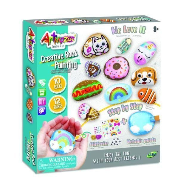 Vytvořte si barevný a veselý kamínek. Můžete malovat, nalepovat a ozdobit dle vlastních představ nebo se inspirovat se motivy na krabici. Vyberte si oblázek, fixem si nakreslete, co Vás napadne a můžete začít s barvičkami. Balení obsahuje: 6 kamínků, 6 x vodové barvy, 2 štětce, samolepky a fix. Věk: 8+ Rozměry balení: 16,5 x 25 x 5 cm