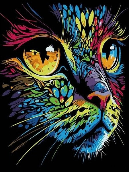 Magická kočka – obraz na černém plátně (30 x 40 cm), malování podle čísel br br Hledáte originální a stylový doplněk do vašeho bytu? Tento ručně malovaný obraz kočky na plátně s tmavým, hlubokým pozadím je přesně to pravé. br br Rozměr 30 x 40 cm je ideální pro zavěšení v obývacím pokoji, ložnici, nebo pracovně. Kočka je zachycena s grácií a mystickou aurou, která k těmto zvířatům neodmyslitelně patří. Kontrast bílých, šedých a žlutých akcentů na černém plátně vytváří zajímavý vizuální efekt, který upoutá pozornost každého návštěvníka. br br Každý tah štětce je originální, což z obrazu dělá unikátní kousek, který nikdo jiný nemá. Obraz je napnutý na kvalitním dřevěném rámu, takže ho můžete ihned vystavit.