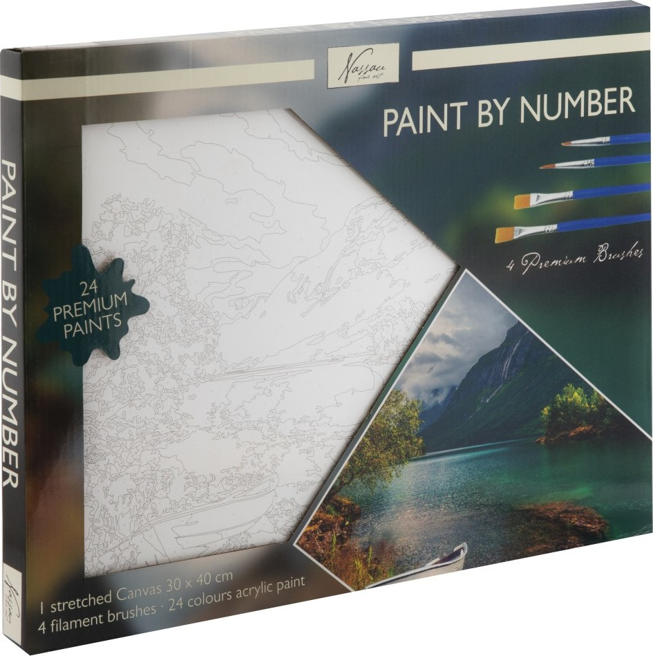 Malování podle čísel na na plátno Krajina 30×40 cm – namalujte si svůj obrázek pomocí čísel, které jsou již předtištěné. Součástí balení je 24 akrylových barev, plátno 30×40 cm s předtištěnými čísly, 2 ploché štetce a 2 kulaté štětce.