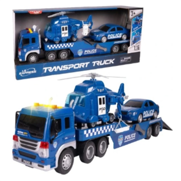 Robustní policejní transportér 3v1 s funkční rampou, zvukovými a světelnými efekty, záchranným vrtulníkem a policejním autem. Skvělá sada pro děti od 3 let, které milují akci, techniku a policejní zásahy.