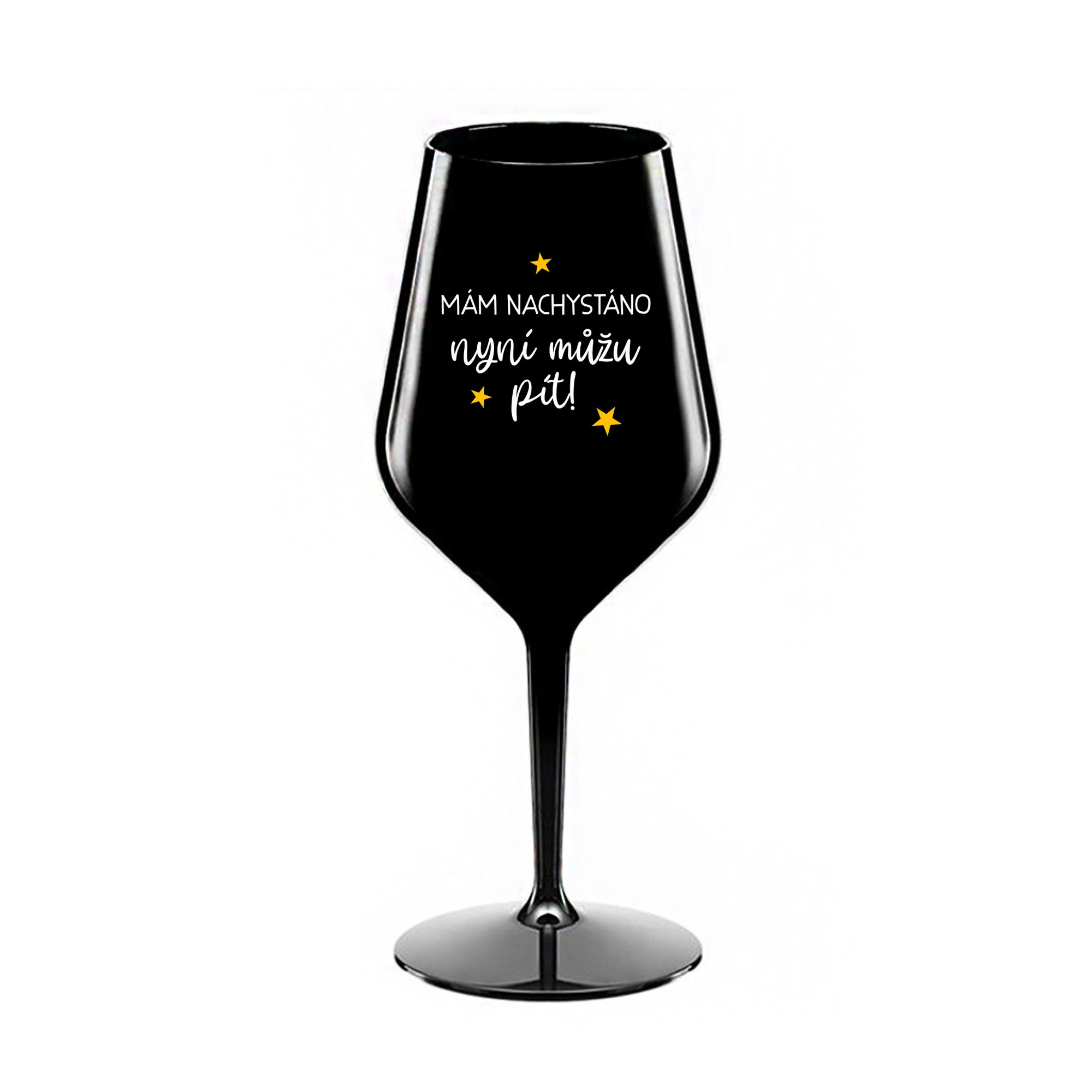 Nerozbitná černá vinná sklenice s motivem MÁM NACHYSTÁNO, NYNÍ MŮŽU PÍT je skvělá na zahradu, pláž, výlet, piknik a parádu udělá i při kempování. Jelikož je vyrobená z kvalitního polykarbonátu je de facto nerozbitná. Je to luxusní kousek, s nímž si víno můžete vychutnat prostě kdekoliv. Mají ergonomický tvar, který příjemně padne do ruky a protože je lehká, usnadňuje to její přenášení. Je snadno skladovatelná a lehce se čistí. Díky svému designu si s ní můžete vychutnat doopravdy kdekoliv bezproblémové pití výborného vína. Materiál PP. Vyrobené s láskou v ČR