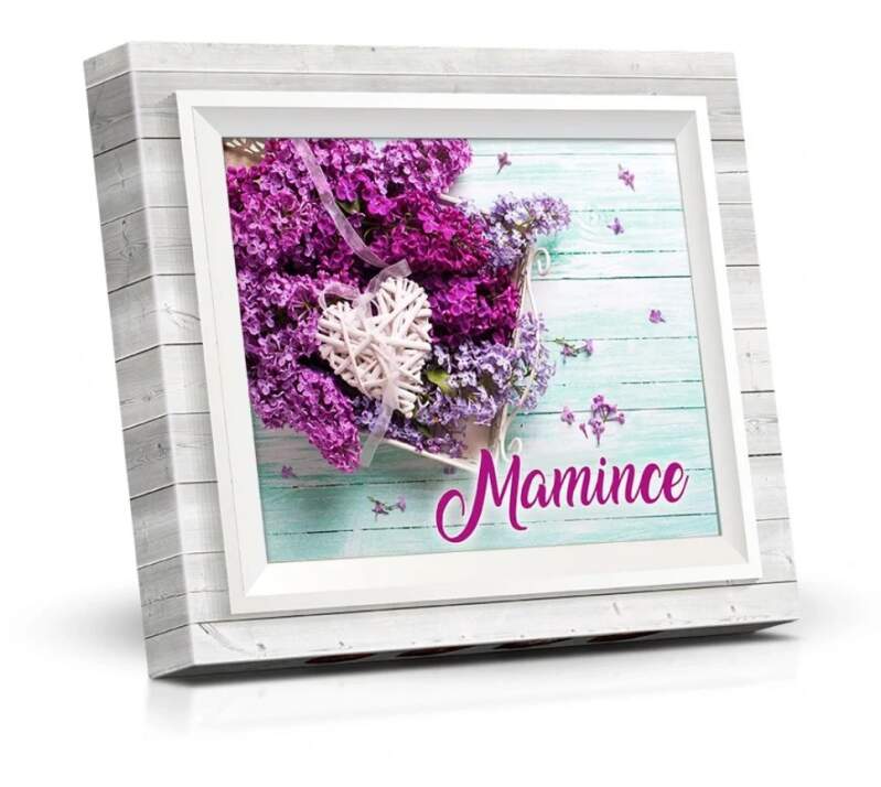 Mamince - Plněné čokoládové pohárky - bílé dřevo 110g Lahodné čokoládové pohárky s lískooříškovým, mandlovým a mléčným krémem. Složení: Hořká čokoláda (cukr, kakaová hmota, kakaové máslo, sušená syrovátka (z mléka), emulgátor: sójový lecitin, aroma vanilin). Náplň (60%): rostlinný tuk (palmový olej), cukr, pražené mandle (5%), sušené odstředěné mléko, sušená syrovátka (z mléka), pražené lískové ořechy (4%), kakaový prášek, kakaová hmota, laktóza (z mléka), sušené mléko, karamelové křupinky (cukr, sójové boby, nehydrogenovaný palmový olej, glukózový sirup, barvivo: karamel E150a, přírodní aroma "karamelové máslo"), práškový jogurt, jahodové lupínky, emulgátor (sójový lecitin), příchuť vanilin, regulátor kyselosti (kyselina mléčná). Informace pro alergiky: Může obsahovat stopy arašídů a lepku. Skladujte na suchém místě, chraňte před teplem. Výživové údaje na 100 g energetická hodnota 2256 kJ / 541 kcal tuky 36,2 g z toho nasycených 19,1 g sacharidy 45,2 g z toho cukry 39,8 g bílkoviny 8,7 g sůl 0,2 g
