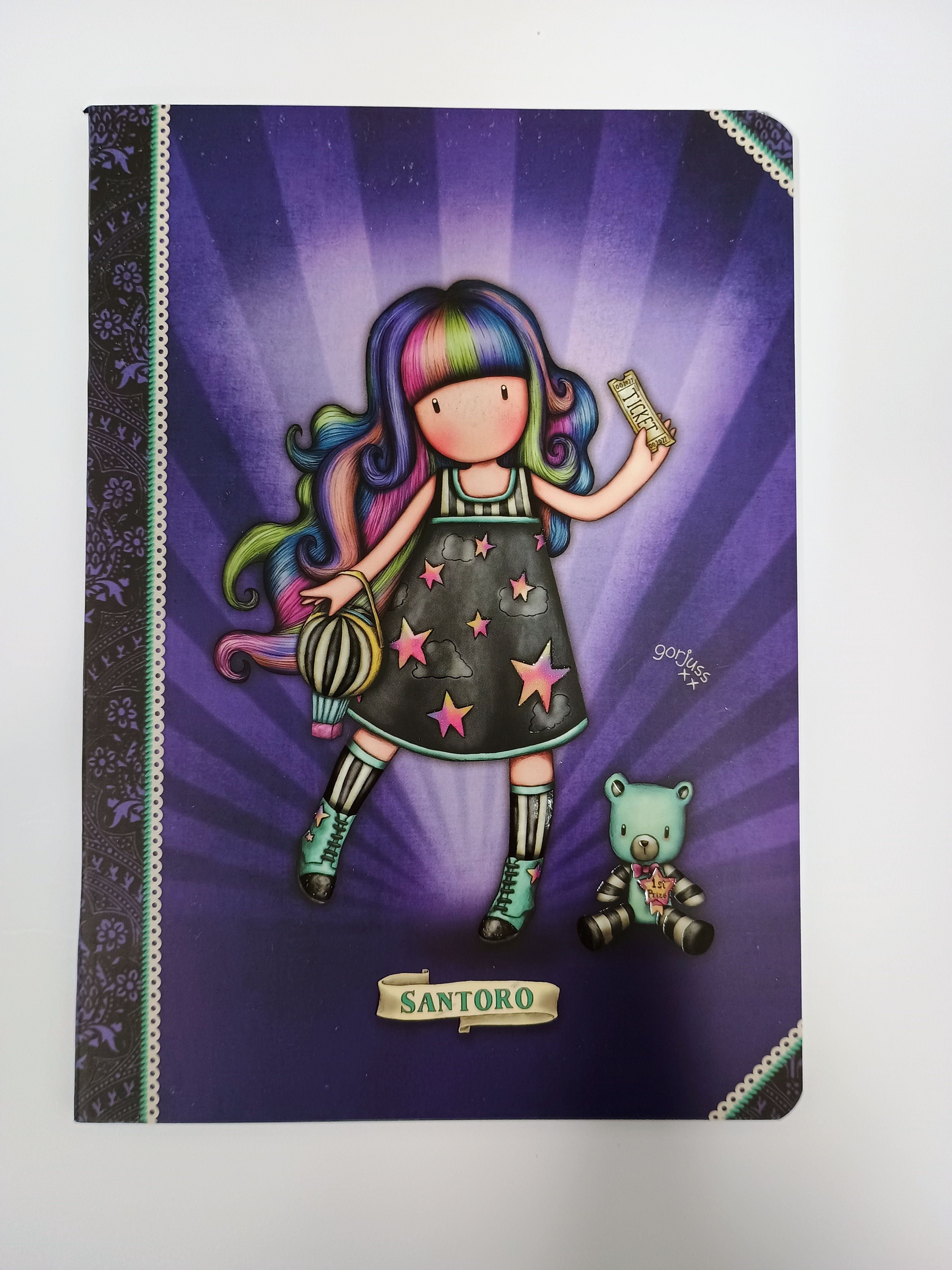 Praktický sešit velikosti A5, je vhodný pro školáky i dospělé.  Atraktivní design oblíbených panenek Santoro Gorjuss je líbivým prvkem úvodní strany. Část obrázku je zvýrazněn glitry a plasticky vystupuje z plochy.  V sešitu je celkem 40 linkovaných listů, papír má gramáž 80 g, vazba je šitá.  Součástí je také natištěný rozvrh hodin.  Bude vybrán náhodný motiv, ze skladově dostupných designů.  Cena je za 1 ks.