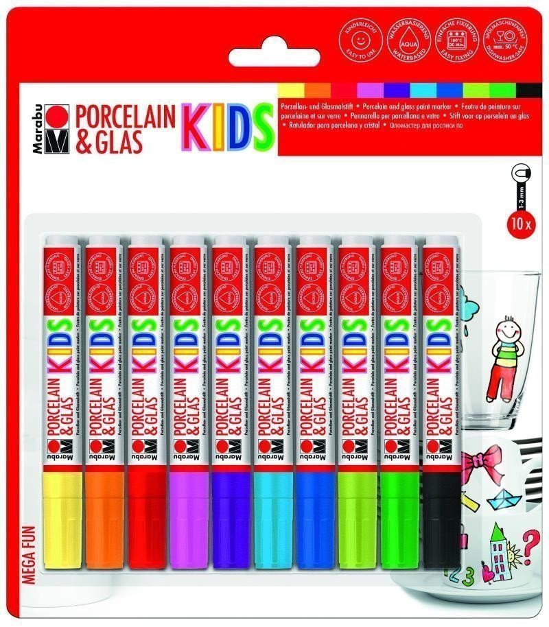 Marabu dětský popisovač na porc. a sklo/sada 10x 1-3mm. Marabu KiDS Porcelain Glas Painter - zábava pro děti na výrobu porcelánu a skla!Nyní mohou děti od 3 let navrhovat např. Vlastní keramické a skleněné nádobí s ideální dětskou značkou „Marabu KiDS Porcelain Glas Painter“. Od chvíle, kdy bratři Grimmové napsali pohádku o Sněhurce, otázka zmatených trpaslíků: Kdo jedl z mého talíře? Kdo pil z mého šálku? bylo dobře známé. Pro bezpečné vytváření návrhů a pohádkových světů na vašich vlastních nádobí a hrncích je k dispozici sortiment 10 barev Marabu v barvách žlutá, oranžová, třešňově červená, malinová, fialová, světle modrá, tmavě modrá, světle zelená, tmavě zelená a černá v balíčku vhodném pro děti. Balení poskytuje další vzory. Doporučujeme nebarvit řezné plochy a hrany na pití. Chlapci a děvčata si tak mohou vytvořit svůj vlastní, naprosto jedinečný porcelán a skleněné nádobí! Připravte si jídlo!Obsah: 10 x Malíř na porcelán a sklo 1-3 mm (žlutá 019, oranžová 013, třešňově červená 031, malina 005, 125 třešeň, fialová 251, světle modrá 090, tmavě modrá 053, světle zelená 062, tmavě zelená 068, černá 073 )