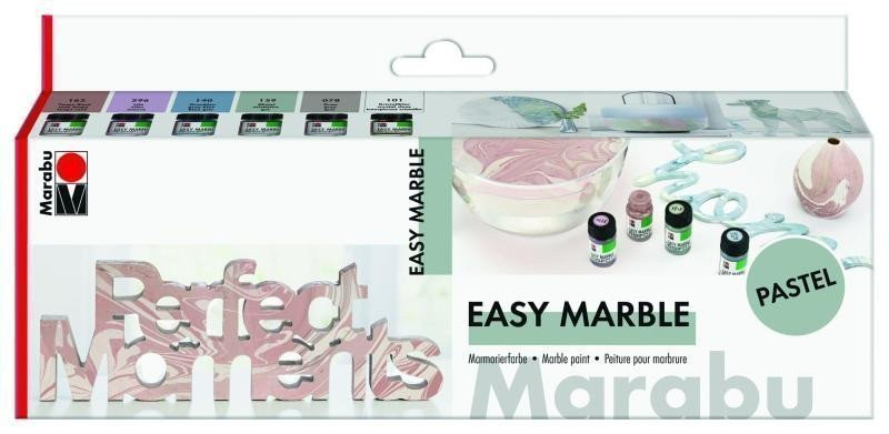 Mramorové efekty převezmou svět designu - vytvořte si vlastní designérské kousky s jemným pastelovým nádechem: Kapejte, ponořte se, hotovo! Jasné pastelové odstíny na bázi organických rozpouštědel jsou ideální pro světlé i tmavě zbarvené předměty ze skla, keramiky, plastu, dřeva a papíru. Nakapejte mramorovou barvu na vodu, nakreslete vzory, pomalu namočte předmět a rychle ho znovu vytáhněte. Bílé pigmenty v pastelových odstínech se silně usazují a je třeba je před použitím intenzivně protřepat. Pokud je to nutné, sejměte odkapávací víčko a promíchejte. Intenzita barvy závisí na velikosti nádoby na vodu a množství aplikované barvy. Pokyny s tipy v přiložené brožuře.Obsah: 6 x 15 ml lehkého mramoru (Rose taupe 165, Lilac 296, Gray blue 140, jmelí 159, Gray 078, Crystal clear 101), 1 x návod