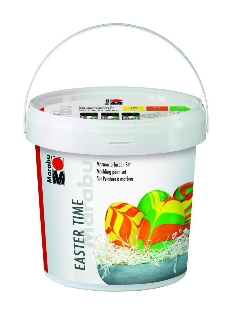Kompletní sada, 3 x 15 ml barva citronu 020, oranžové 013 a světle zelené 062, 5 plastových vajíček , výška: 60 mm, 7 dřevěných špachtlí, délka: 100 mm, přibližně 10 g velikonoční trávy a pokynů, v plastovém kbelíku. Brilantní mramorové barvy vykouzlí trendy velikonoční dekorace.Elegantní barevná kombinace dává každému velikonočnímu koši něco zajímavého.- můžete začít okamžitě: kompletní sada- barva na bázi organických rozpouštědel- suchá po cca 15 minutách- po úplném zaschnutí ji lze otřít vlhkým hadříkem- na nelakované předměty- dodávka v praktickém plastovém kbelíku, který lze použít také jako nádobku na barvení