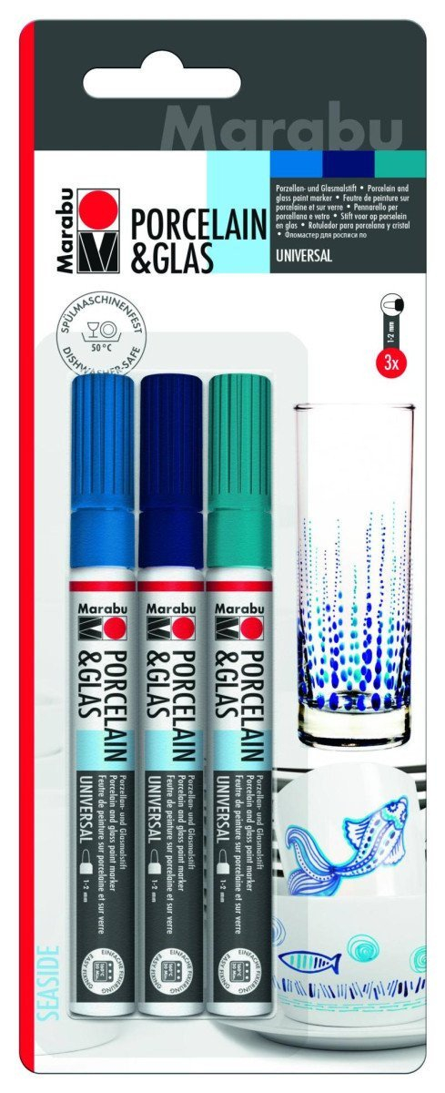 Marabu popisovač na porc. a sklo/sada 3x 12mmOzdobte svůj porcelán v barvách moře!Namalujte si svůj porcelán v těchto oceánských barvách od Marabu. Malování šálku se svým jménem nebo krásným designem je skvělá zábava - navíc se můžete pyšnit vytvořením něčeho jedinečného. Podívejte se, co můžete udělat! Namalovaný porcelán nechejte 4 hodiny zaschnout a poté ho v peci zafixujte na 160 ° C po dobu 30 minut. Pak bude v myčce. Třídílná sada Seaside obsahuje: hořec, noční modř a benzín.