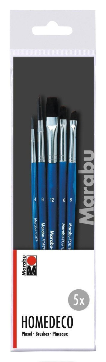 Sada 5 štětců pro všechny dekorativní techniky, zejména na drsné povrchy, jako je dřevo, látka, plátno, kámen atd. Rukojeti jsou vyrobeny z FSC certifikovaného dřeva. Forte plochý č.6 a 12, Forte kulatý č.4 a 8, forte seřízlý č.8.
