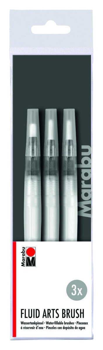 Marabu štětec vodou-plnitelný sada 3ks Sada štětců plnitelná vodou s jemnými a elastickými chloupky. Ideální pro malování, psaní a míchání barev na papír a látku. Obsah: 1 x vodou plnitelný štětec plochý 5 mm, 1 x vodou plnitelný štětec kulatý 4 mm, 1 x vodou plnitelný štětec kulatý 3 mm