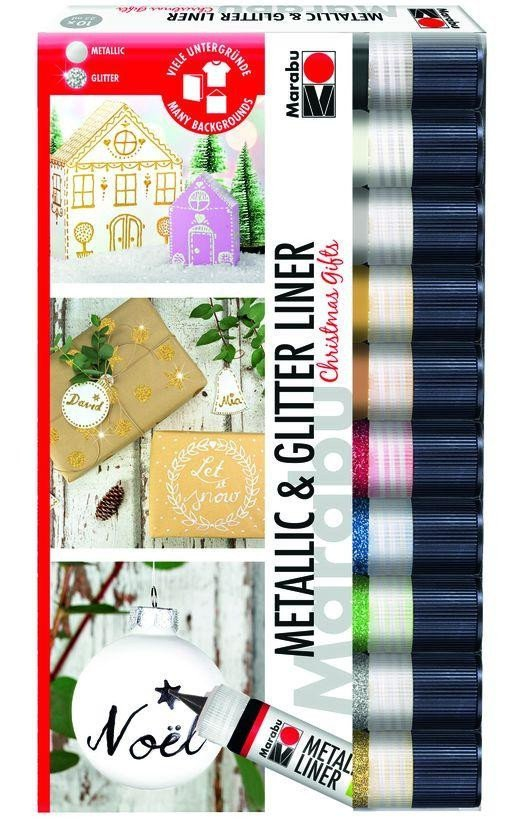 Se sadou vánočních dárků Metallic Glitter Liner lze na Vánoce jednotlivě malovat a psát různé předměty. Vánoční ozdoby, ozdoby na stromek, barvy nebo dárky dostanou individuální nádech. Široká škála barev: 5 třpytivých a 5 metalických barev.Víceúčelová vodou ředitelná, světlostálá efektní barva s metalickými a třpytivými efekty. Malířské povrchy: papír, dřevo, kov, sklo, kůže, plast, textil (s max. 20% obsahem syntetických vláken). Techniky: Malování, psaní, zdobení. Po fixaci žehličkou (zadní strana po dobu 3 minut bez páry) nebo v sušičce (8 min. / 150 ° C) jsou textilie odolné vůči praní do 40 ° C. Doba schnutí: cca. 6-12 hodin.Obsah: 5 x 25 ml Marabu Metallic Liner (metalicko-grafitová 779, metalicko-bílá 770, metalicko-stříbrná 782, metalicko-zlatá 784, metalická-měď 787), 5 x 25 ml Marabu Glitter Liner (Glitter-rubínová 538, Glitter - safír 594, třpytky kiwi 561, třpytky stříbro 582, třpytky zlato 584)