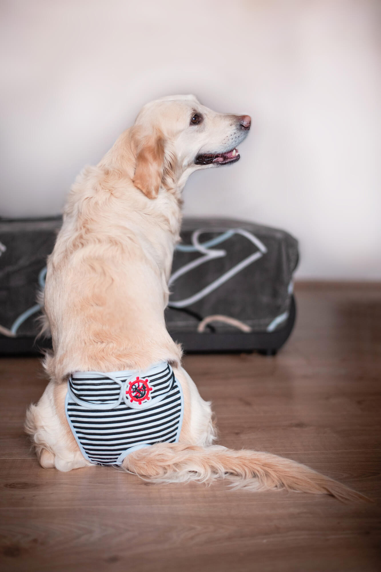 Hárací kalhotky jsou nezbytnou součástí výbavy každé fenky, která zrovna prochází obdobím hárání. Toto psychicky poměrně náročné období můžeme pejskům zpříjemnit díky pohodlným a skvěle padnoucím kalhotkám. Materiál Kalhotky pro psy jsou ušity z bavlny a polyesteru. Zapínání Kalhotky lze pohodlně natáhnout pomocí gumy. Funkčnost Hárací kalhotky jsou vhodné pro fenky v období hárání. Díky praktickým kalhotkám můžeme zamezit ušpinění bytu. Námořnický motiv skvěle podtrhuje celkový design. Kalhotky disponují praktickým otvorem pro ocásek a díky síťce jsou prodyšné. Kalhotky je možné prát v pračce na 30°C. Rozměr Obvod slabin S 26 - 32 cm M 30 - 40 cm L 34 - 44 cm XL 46 - 62 cm 2XL 53 - 74 cm