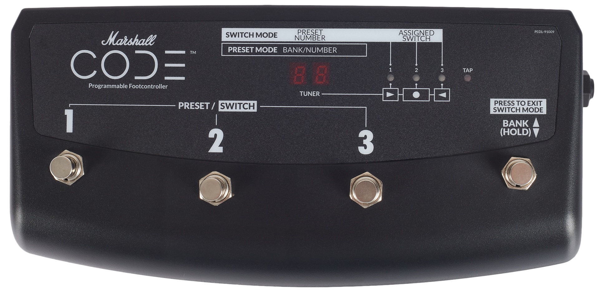 Nožní přepínač Rozšiřte své Marshall kombo nebo hlavu ze série CODE o tento pedál a jeho ovládání bude ještě snadnější. K dispozici jsou čtyři kovová tlačítka. První tři slouží k přiřazení určitého presetu, můžete tak plynule měnit například mezi čistým zvukem, overdrivem a úplným zkreslením. Volba presetů je ale pochopitelně zcela na vás a kreativitě se meze nekladou. Čtvrtý pedál slouží pro rychlé procházení bankou presetů. O číslech jednotlivých presetů informuje LED displej a pedál lze použít i pro funk