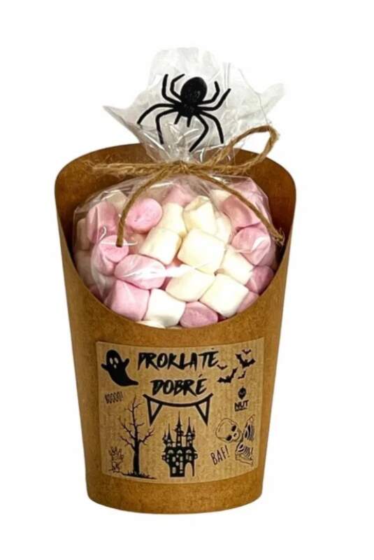 MARSHMALLOW v celofánku a kelímku 70g - PROKLATĚ DOBRÉ Darujte vynikající marshmallow ve stylovém halloweenském kelímku. Pozor, jsou proklatě dobré. Složení: glukózový sirup, cukr, voda, želatina, koncentrát šťávy z hroznového vína 1,25%, regulátor kyselosti (kyselina citronová), zahušťovadlo (pektin) barviva (koncentrát šťávy černé mrkve), aromata, leštící směs (kokosový olej, leštící látka (karnaubský vosk)). (1,25% ovocného koncentrátu = 5% ovocné šťávy)