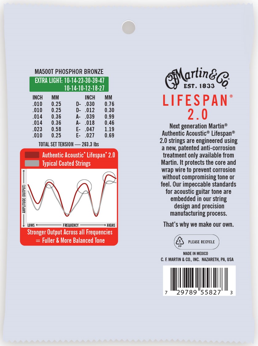 Struny pro dvanáctistrunnou kytaru Struny Martin Authentic Lifespan 2.0 jsou navrženy s ohledem na potřeby aktivních hudebníků, musí tedy obstát v náročném prostředí neustálých koncertů a zkoušek. Při jejich výrobě byla použita nově patentovaná technologie, která účinně brání korozi, aniž by nepříznivě ovlivňovala zvuk. Tyto struny ocení zejména hráči s agresivnějším potem. Jejich základem je pocínované ocelové jádro ovinuté na basových strunách slitinou fosforbronz. Výsledkem je vřelý, zak