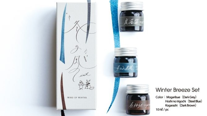 • sada 3 inkoustů • obsah každé lahvičky 10 ml • každá barva inkoustu je pojmenována po tradičním japonském větru • lze je použít se skleněnými pery, plnicími pery a namáčecími pery • vodou rozpustný inkoust • obsahuje barvy: Mogaribue (Dark Grey), Hoshi no Irigochi (Steel blue), Kogarashi (Dark Brown)