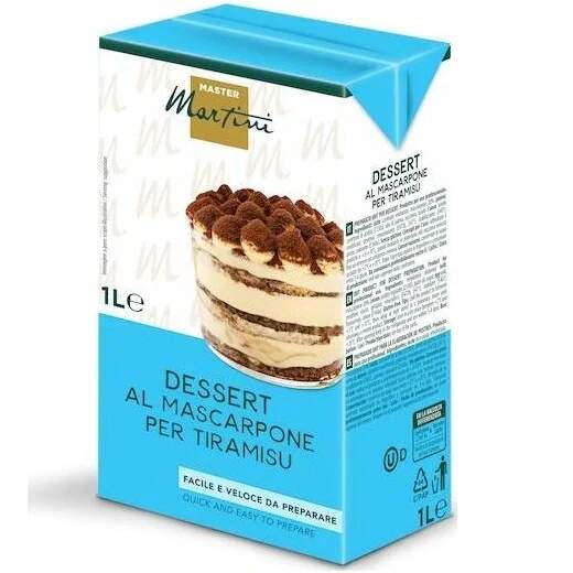 Výrobek vhodný pro přípravu oblíbeného dezertu Tiramisu. Stačí vychladit, vyšlehat a servírovat. Postup: ochlaďte výrobek na 5-10°C a poté vyšlehejte při vysoké rychlosti v mixéru, dokud nezískáte krémový produkt. Piškoty namočené v kávové tekutině skládejte do skleničky / pohárku / formy a prokládejte připraveným krémem. Poslední vrstvu krému posypte zlehka kakaovým práškem. Dezert můžete dozdobit čokoládovou dekorací s nápisem "Tiramisu". Složení: sušené odstředěné mléko, mascarpone 20% (smetana, regulátor kyselosti E330, palmový olej, cukr, vaječný žloutek, modifikovaný škrob, želatina, emulgátor E472b, E471, stabilizátor E407, aromata, barvivo E160a. Bezlepkový. Výživové hodnoty (ve 100g výrobku): Energetická hodnota: 1140 kJ/ 275 kcal; tuky 22 g (z toho nasycené mastné kyseliny 12 g); sacharidy 16 g (z toho cukry 14 g); bílkoviny 3,2 g; sůl 0,15 g.