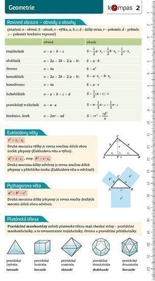 Shrnutí:Přehledy vybraných důležitých vzorců a vět středoškolské matematiky.Popis:Desetidílný užitečný pomocník při studiu matematiky, vytištěný na tvrdším laminovaném papíru v praktickém formátu oboustranných záložek. Obsahy jednotlivých dílů 1–10 Edice KOMPAS: Kompas 1 – Základní poznatky: číselné obory, dělitelnost přirozených čísel, intervaly, množinové operace, logika Kompas 2 – Geometrie: vzorce pro obsahy, obvody, objemy, povrchy, Eukleidovy věty, Pythagorova věta Kompas 3 – Algebra: mnohočleny, vzorce pro úpravy mnohočlenů, pravidla počítání s mocninami a odmocninami, usměrňování zlomků Kompas 4 – Goniometrie a trigonometrie: goniometrické funkce, míra stupňová a oblouková, základní hodnoty goniometrických funkcí, goniometrické vzorce, věty sinová a kosinová Kompas 5 – Posloupnosti a finanční matematika: vlastnosti posloupností, aritmetická a geometrická posloupnost, úroky, inflace, spoření Kompas 6 – Logaritmy: logaritmické funkce, pravidla pro počítání s logaritmy Kompas 7 – Kombinatorika: faktoriál, permutace, variace, kombinace, binomická věta Kompas 8 – Analytická geometrie, kuželosečky I: kružnice, parabola, středové rovnice, vzájemná poloha přímky a kuželosečky, analytické řešení Kompas 9 – Analytická geometrie, kuželosečky II: elipsa, hyperbola, středové rovnice, vzájemná poloha přímky a kuželosečky, analytické řešení Kompas 10 – Diferenciální a integrální počet: věty o limitách, důležité limity, pravidla pro derivování, derivace elementárních funkcí, základní vzorce pro primitivní funkce