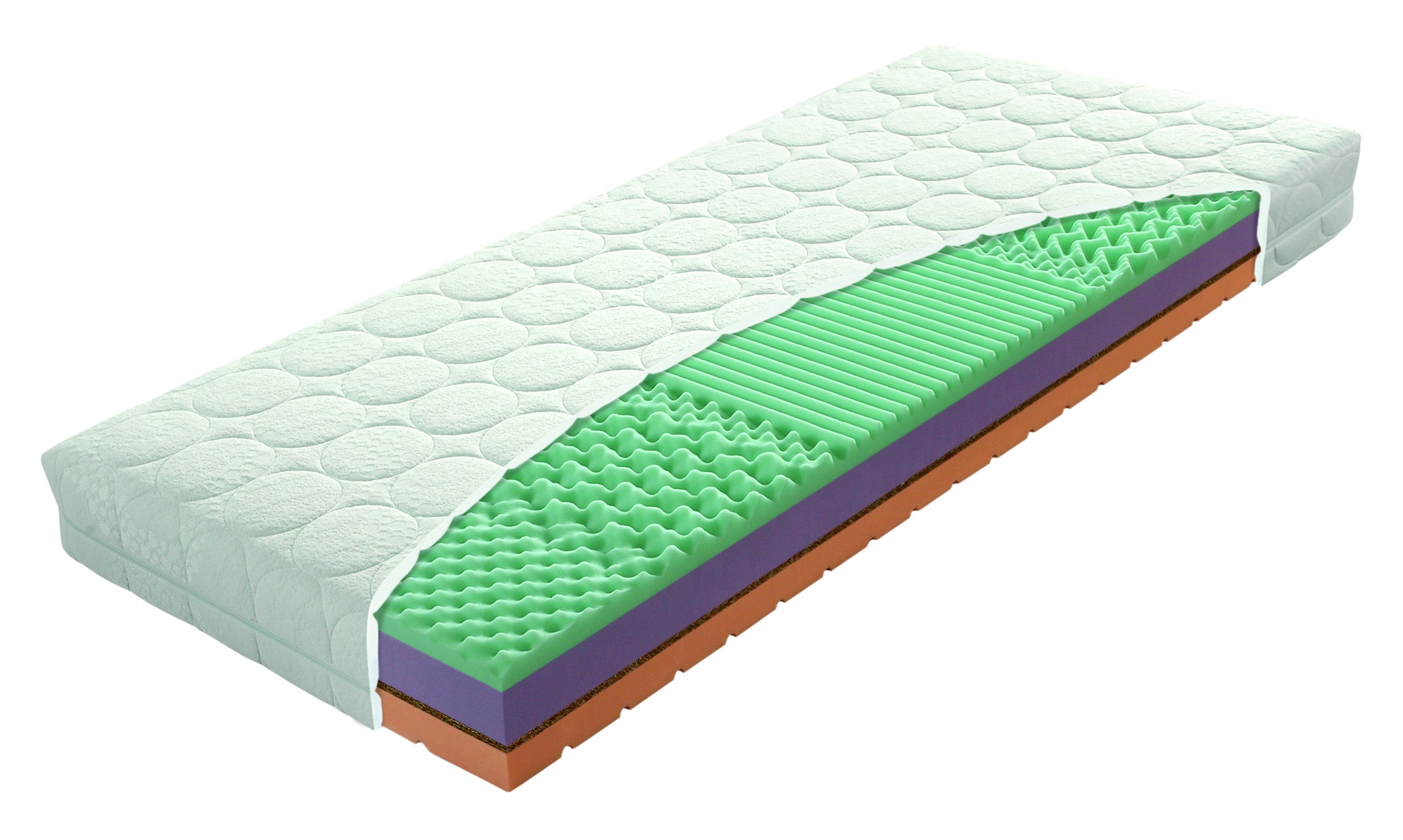 • první vrstva - značková pěna ELIOCELL s masážním profilem o hustotě 28 kg/m³ (zelená barva pěny)