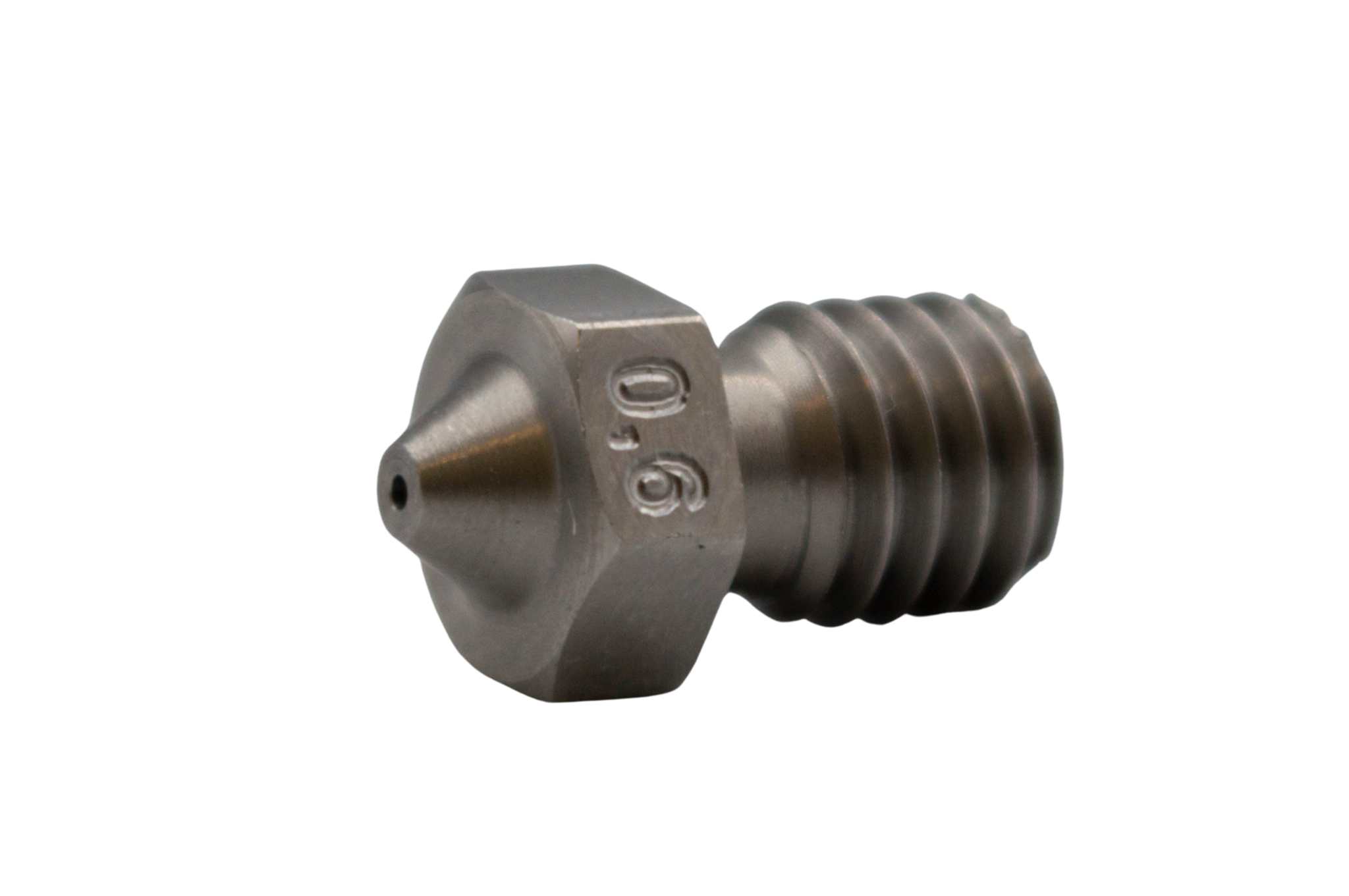 Kvalitní tvrzená tryska 0,60 mm se závitem M6 vhodná k tisku 1,75 mm široké struny. Tryska je část tiskové hlavy (extruderu), která určuje jak detailní bude Váš výtisk. Použitím trysky s menším otvorem dosáhnete jemnějšího tisku, ale zároveň roste výrazně celková doba tisku. Nejpoužívanější je tryska o průměru 0,4 mm. Tato tryska je vhodná pro tisk materiálů s vyšší abrazivostí (plast s příměsí kovových či skelných vláken, s příměsí karbonu, s flitry, svítící ve tmě apod.). Po našroubování trysky na hotend, doporučujeme ohřát tiskovou hlavu na pracovní teplotu (přibližně 230°C) a trysku za tepla dotáhnout, aby nedocházelo k netěsnostem. Tryska je vhodná např. pro tiskárny Elegant3D Printer 2, Prusa i3 a všechny další, které mají závit pro trysku o velikosti M6. Více o tom, jak vybrat trysku a proč je pro výsledný výtisk důležitá najdete zde.