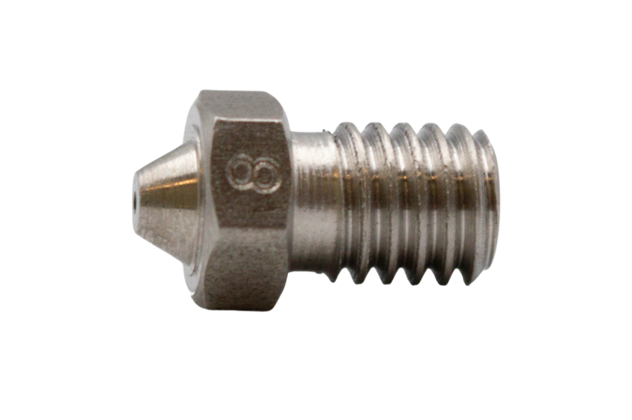 Kvalitní tvrzená tryska 0,80 mm se závitem M6 vhodná k tisku 1,75 mm široké struny. Tryska je část tiskové hlavy (extruderu), která určuje jak detailní bude Váš výtisk. Použitím trysky s menším otvorem dosáhnete jemnějšího tisku, ale zároveň roste výrazně celková doba tisku. Nejpoužívanější je tryska o průměru 0,4 mm. Tato tryska je vhodná pro tisk materiálů s vyšší abrazivostí (plast s příměsí kovových či skelných vláken, s příměsí karbonu, s flitry, svítící ve tmě apod.). Po našroubování trysky na hotend, doporučujeme ohřát tiskovou hlavu na pracovní teplotu (přibližně 230°C) a trysku za tepla dotáhnout, aby nedocházelo k netěsnostem. Tryska je vhodná např. pro tiskárny Elegant3D Printer 2, Prusa i3 a všechny další, které mají závit pro trysku o velikosti M6. Více o tom, jak vybrat trysku a proč je pro výsledný výtisk důležitá najdete zde.