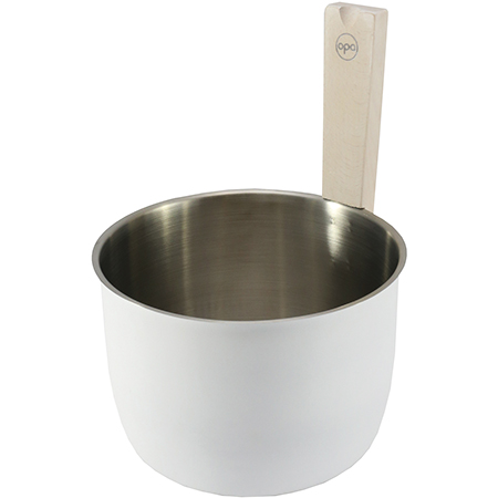 Luxusní matné bílé vědro do sauny určené pro vodu, které slouží k polévání saunových kamenů, s objemem 5 litrů, průměr ø 23 cm. Rukojeť je vyrobena z buku, vnitřní část vědra je z kvalitní nerezové oceli.