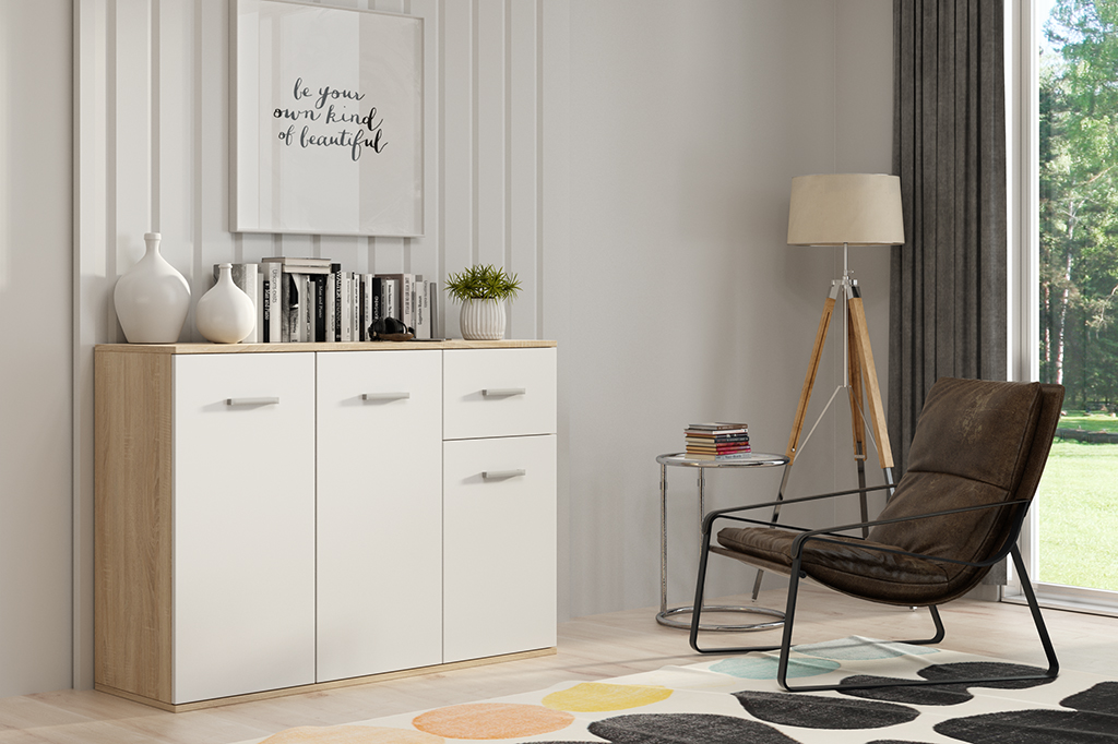 Komoda Jacob V. • Vlastnosti: Materiál Komoda je vyrobena z laminované dřevotřískové desky o síle 16 mm. Hrany desek Hrany desek jsou opatřeny ABS lištou. Zadní stěna Na zadní stěnu jsou použity sololitové desky. Úchyty Úchyty jsou plastové. • Barevné provedení Komoda je vyrobena v odstínu dub sonoma, nebo v kombinaci dub sonoma a bílé dveře. Dub sonoma Bílá • Rozměry 85 cm celková výška 112 cm celková šířka 35 cm celková hloubka 16 mm tloušťka desky • UpozorněníOdstíny prezentované na fotografiích jsou ilustračním materiálem, barvy se mohou lišit od vyobrazení na fotografiích podle nastavení vašeho zobrazovacího zařízení.