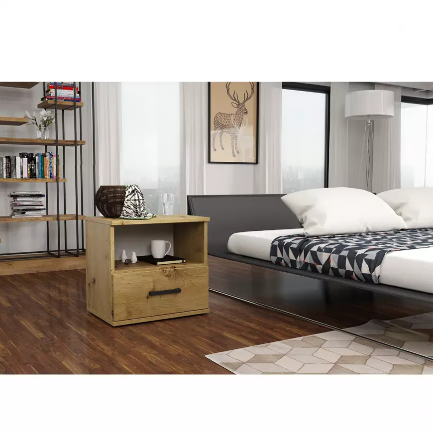 Noční stolek Goda 2 1S • Vlastnosti: Materiál Komoda je vyrobena z laminované dřevotřískové desky o síle 16 mm. Hrany desek Hrany desek jsou opatřeny ABS lištou. Zadní stěna Na zadní stěnu jsou použity sololitové desky. Úchyty Úchyty jsou plastové. • Barevné provedení Noční stolek je vyroben v odstínu dub artisan, dub sonoma, nebo v kombinaci dub sonoma a bílá. Dub artisan Dub sonoma Bílá • Rozměry 50 cm celková výška 48 cm celková šířka 35 cm celková hloubka 16 mm tloušťka desky • UpozorněníOdstíny prezentované na fotografiích jsou ilustračním materiálem, barvy se mohou lišit od vyobrazení na fotografiích podle nastavení vašeho zobrazovacího zařízení.