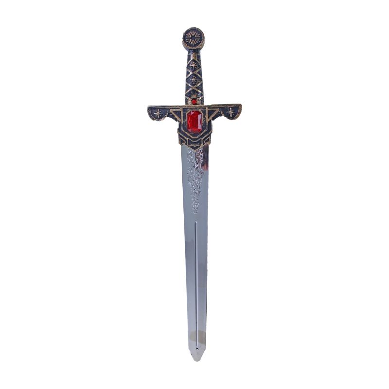Meč rytířský 55cm se zvukem Chystáš se na souboj v rytířském klání? Tak tento meč je pro tebe naprosto ideální. Meč s bronzovou rukojetí a stříbrnou čepelí je dlouhý cca 55 cm a vydává zvuky. Obsahuje 3 ks baterií typu LR44.