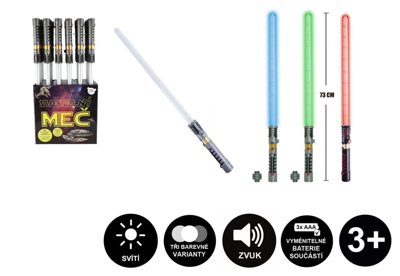 Meč při pohybu mění zvuk, při zasažení cíle vydává zvuk a svítí. Vybrat si můžete ze 3 barevných variant. Na baterie 3x AAA, které jsou součástí hračky.Rozměr meče: 73 cmVhodné pro děti od 3 let