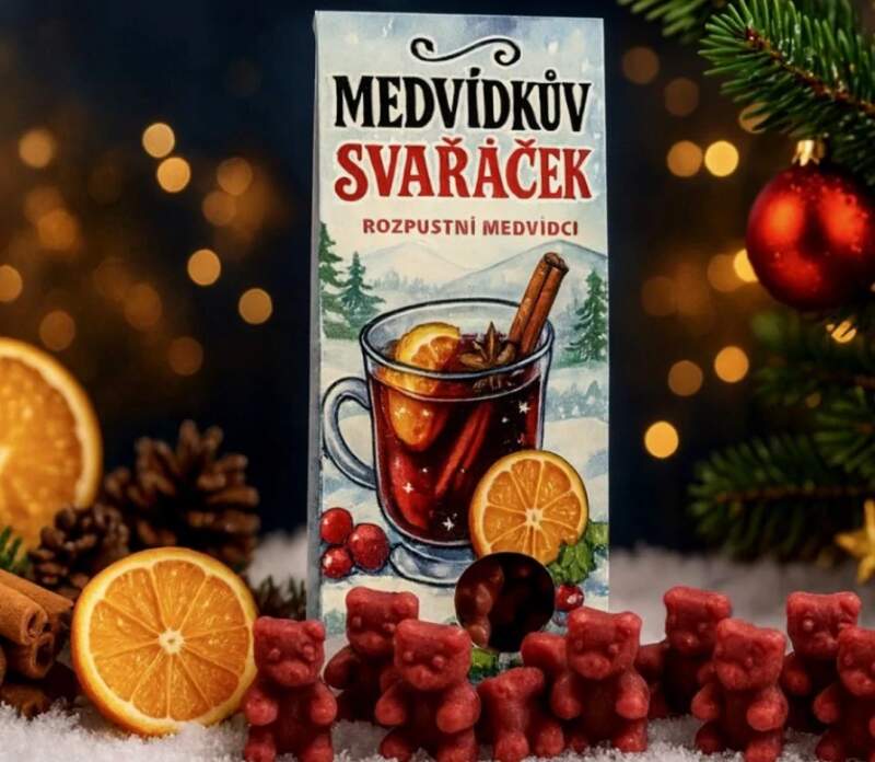 Voňaví čajoví medvídci s příchutí tradičního svařeného vína. Hřejivá zimní limitovaná edice bez alkoholu – ideální pro dlouhé večery i jako originální vánoční dárek. MEDVÍDKŮV SVAŘÁČEK v sobě ukrývají hřejivou chuť tradičního svařeného vína – skořice, hřebíček, pomeranč a jemný nádech červeného vína. Hmotnost: 50g Složení: cukr, glukózový sirup, želatina, voda, koncentrovaná šťáva z bílých hroznů, kyselina citrónová; extrakt z bílého čaje, rostlinný extrakt (bezinka), ovocné sladidlo, koncentrát jablečné šťávy, koncentrovaná meruňková šťáva, koncentrovaná hrušková šťáva, karnaubský vosk.