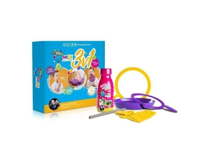 Vyfoukni velkou bublinu, odrážej bublinu na ruce, zahraj si bublinový tenis! Luxusní dárková sada s tím nejlepším bublifukem! Megabublina 3V1 = Velké bubliny, Skákací bubliny, Bublinový tenis Sada obsahuje: Bublifuk Megabublina 250 ml - bublifuk s jedinečnou a originální recepturou, 2 x kroužek na foukání velkých bublin, 2 x látkový potah, Miska na bublifuk, Trubička na menší bubliny, Vyfoukni velkou bublinu, odrážej bublinu na ruce, zahraj si bublinový tenis! Megabublina je na trhu již od roku 2011, s bublinami máme 4 zápisy v Guinnesově knize rekordů, v roce 2018 jsme získali krásné 3. místo v prestižní soutěži Hračka roku. Garantem značky je profesionální bublinář Matěj Kodeš, držitel mnoha světových rekordů s mýdlovými bublinami. Použití: Po otevření foukejte bubliny, neřeďte. Používejte s náčiním, které je součástí balení. Velké bubliny – Nalijte kapalinu do misky. Plastový kroužek namočte do bublinové kapaliny. Bubliny tvořte máváním či foukáním. Skákací bubliny – Natáhněte si látku na ruce jako rukavičky. Otevřete lahvičku s bublifukem a brčko, které je součástí setu, namočte do kapaliny. Vytáhněte brčko z láhve a držte ho svisle dolů, jemně nafoukněte malou bublinu. Letící bublinu začněte odrážet. Zkoušejte triky s několika bublinami najednou. Bublinový tenis – Látkový potah natáhněte na plastové kroužky – rakety na bublinový tenis jsou připraveny. Otevřete lahvičku s bublifukem a brčko, které je součástí setu, namočte do kapaliny. Vytáhněte brčko z láhve a držte ho svisle dolů, jemně nafoukněte malou bublinu. Letící bublinu začněte odrážet připravenými raketami. Pozvěte kamarády na bublinový turnaj! Odrážejte, pinkejte, bavte se!