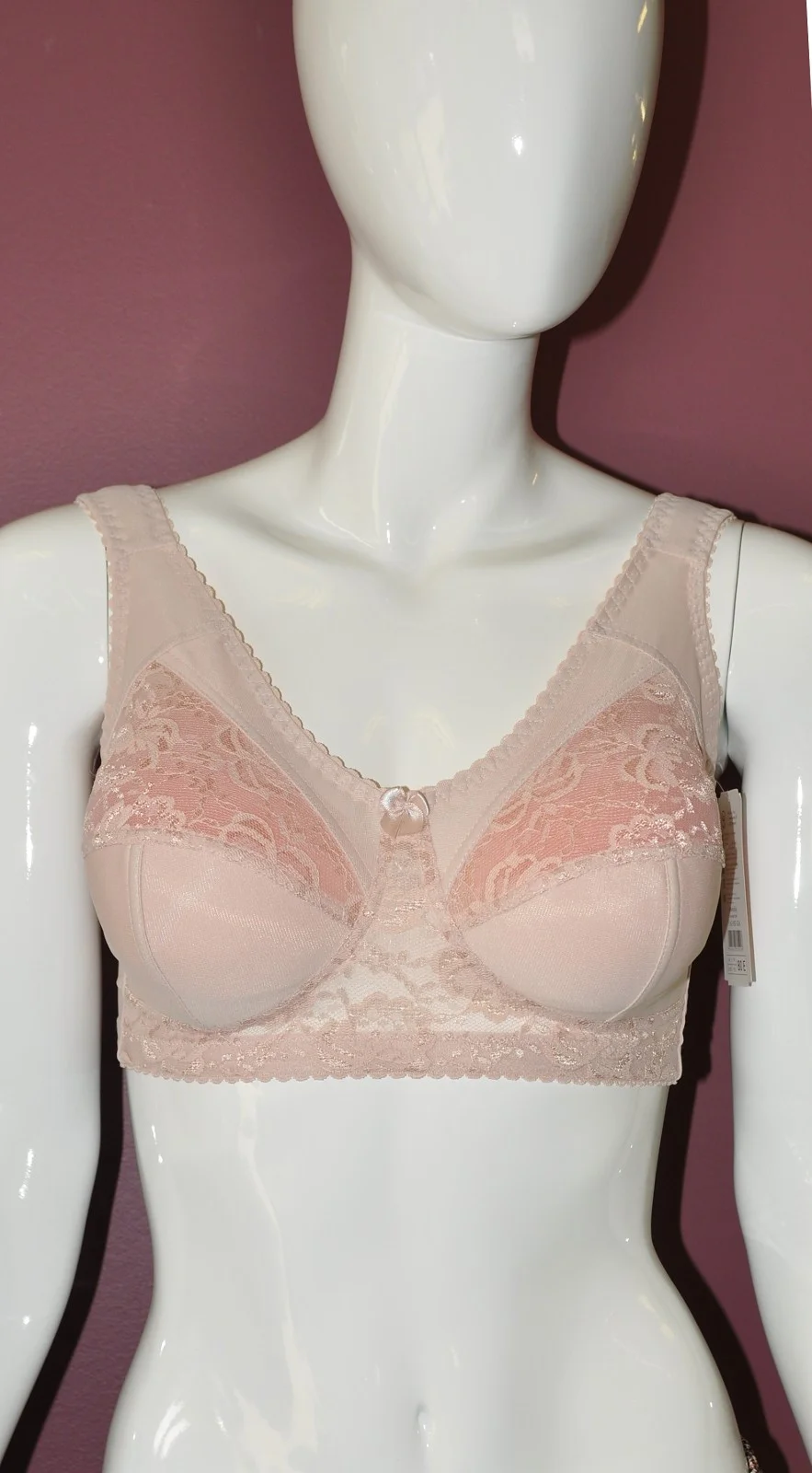 Pohodlná a komfortní dámská podprsenka pro ženy s větším a plnějším poprsím. Měkké košíčky nemají kostice. Podprsenka je vyrobená ze síťoviny a je do poloviny podšitá tkaninou. Horní část košíčků je průsvitná a je ozdobená krajkou. V místě spojení košíčků je saténová mašlička. Pohodlná široká ramínka jsou zárukou komfortu při nošení. Složení: 90 % polyamid, 10 % elastan.