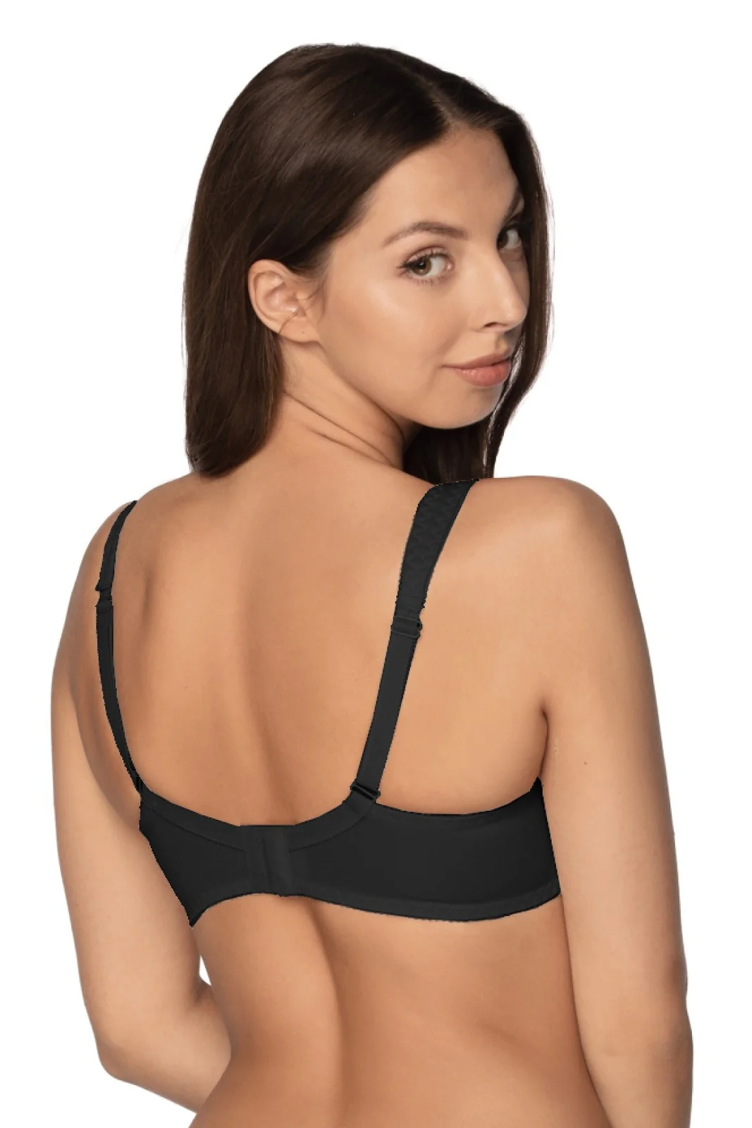 Měkká dámská podprsenka typu "soft" s kosticemi. Spodní část košíčků je podšitá materiálem. Vrchní část košíčků lemuje ažurová krajka. Boční panely pěkně stahují poprsí ke středu hrudníku. Model je vhodný pro ženy s větším poprsím. Podprsenka se zapíná dvěma, nebo třemi háčky s trojí možností nastavení délky obvodu. Složení: 75 % polyamid, 15 % bavlna, 10 % elastan.