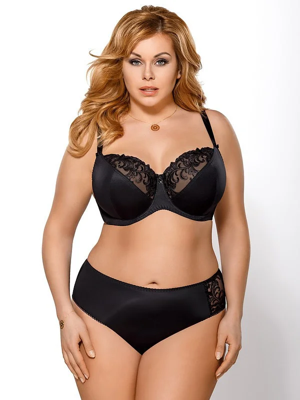Měkká dámská podprsenka s kosticemi. Vrchní část košíčků tvoří jemná tylová síťovina, která je ozdobená efektní výšivkou. V místě spojení košíčků je saténová mašlička s lesklým kamínkem. Boky podprsenky jsou zpevněné svislými kosticemi. Ramínka není možné odepnout. Složení: 90 % polyamid, 7 % elastan, 3 % polyester.