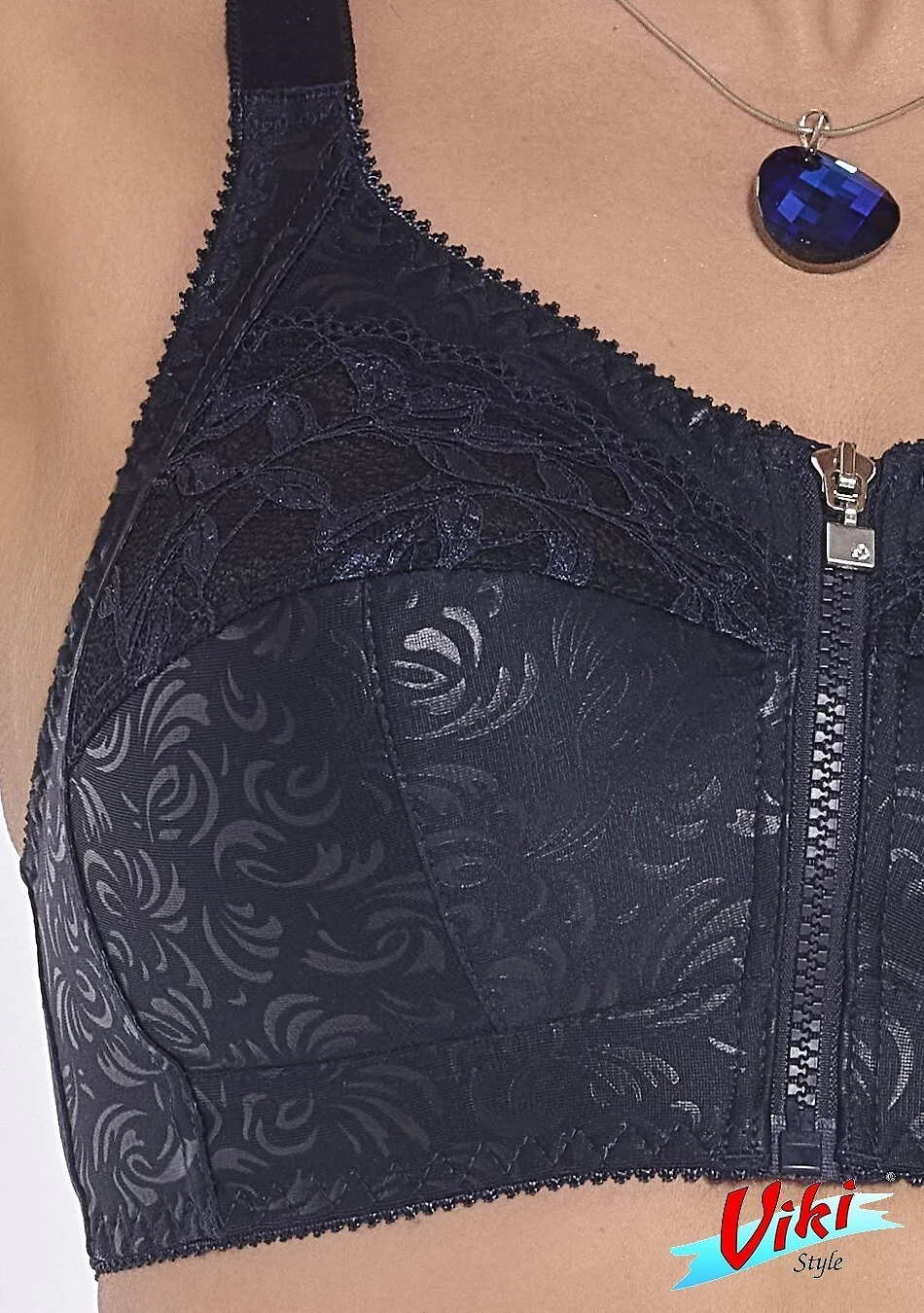 Podprsenka pro ženy s větším a plným poprsím - měkká, bez kostic - zapínání vpředu na zip - horní linie z ažurové krajky podšité průhlednou látkou - bavlněné lemování švů - pohodlná široká ramínka pro pohodlí při používání - měkká konstrukce podprsenky pro celodenní pohodlí Složení: 73 % polyamid, 20 % bavlna, 7 % elastan