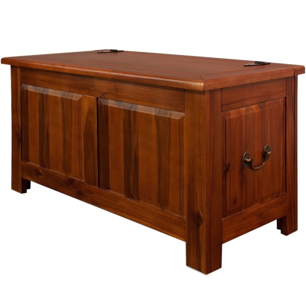 Tato originální truhla v antickém koloniálním stylu vyrobená z akátového dřeva - velmi výrazného a tvrdého dřeva, vyniká nejen svým neobvyklým vzhledem, ale také rozsáhlým úložným prostorem. Kovové rukojeti po stranách také zdůrazňují rustikální dojem.