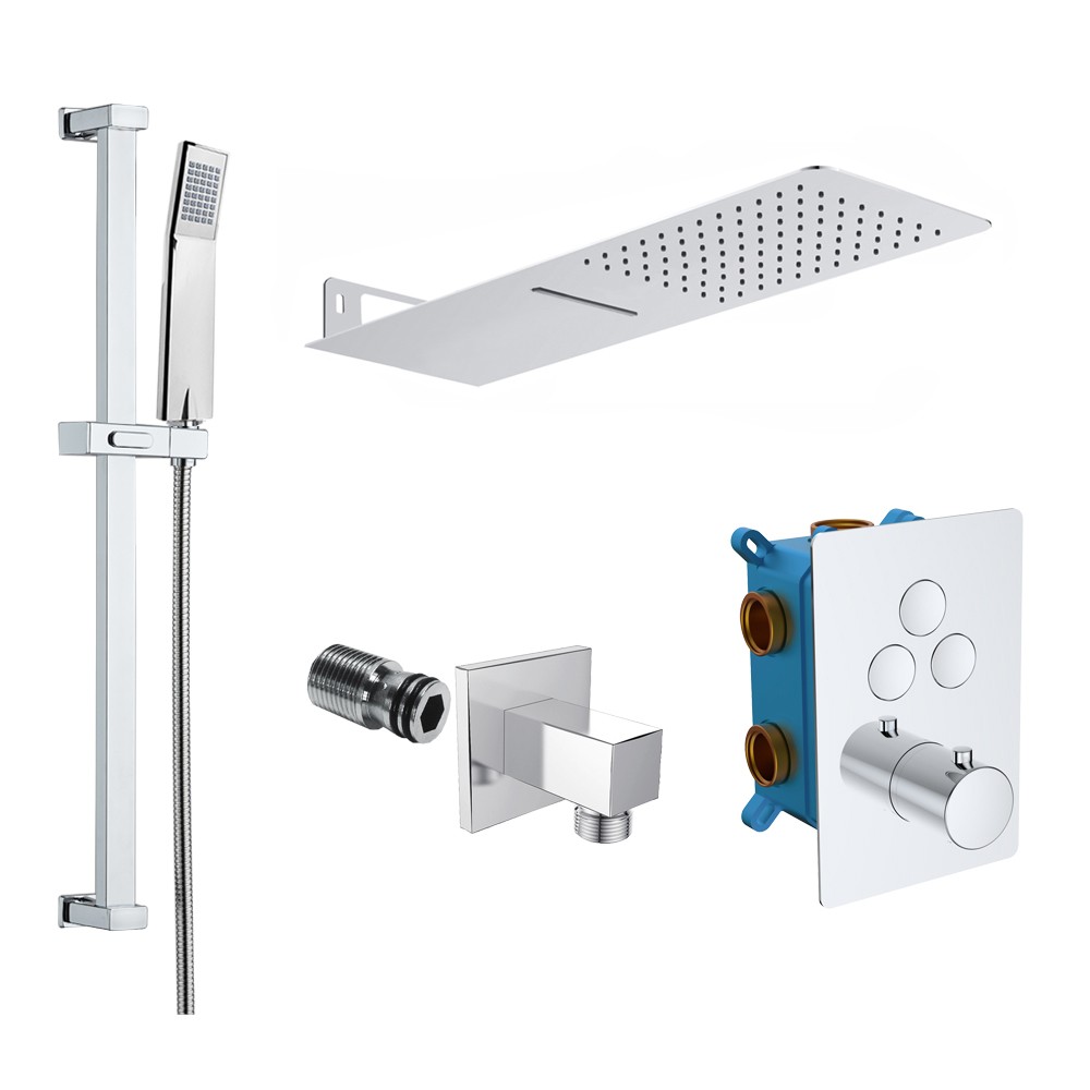 Speciálně navržená kolekce termostatických baterií. Jejich unikátnost spočívá především v možnosti nastavení si přesné teploty výstupní vody, která se nemění ani při přerušení sprchování. Tím šetří nejen vodu, ale i enegie a náklady na ohřev. Teplotu vody lze nastavit bez jakýchkoliv překážek až do 38 ̊C. Pro nastavení vyšší teploty je nutné zmáčknout pojistku, která nedovolí dětem zvýšit teplotu vody a chrání je tak před opařením. Výhodou je také nízká hlučnost a kartuše s dlouhou životností. V baterii je nastavený maximální průtok vody, bez možnosti další regulace.Třícestná varianta (přepínání tří poloh tlačítkem) je určena do sprchových koutů s ruční, hlavovou sprchou a dalším zdrojem tekoucí vody, např. vodopádem.- 5 let záruka na baterii- servis vodovodních baterií zajištěný v rámci ČR a SRSoučástí setu je talířová sprcha s vodopádem 500x200 mm, posuvný držák, jednopolohová sprcha, dvouzámková nerez hadice 150 cm, stěnový vývod.