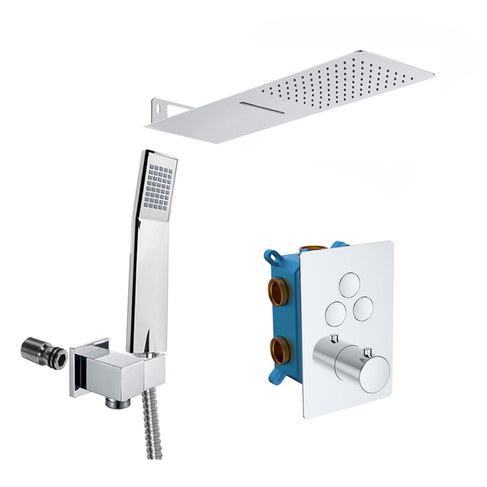 Speciálně navržená kolekce termostatických baterií. Jejich unikátnost spočívá především v možnosti nastavení si přesné teploty výstupní vody, která se nemění ani při přerušení sprchování. Tím šetří nejen vodu, ale i enegie a náklady na ohřev. Teplotu vody lze nastavit bez jakýchkoliv překážek až do 38 ̊C. Pro nastavení vyšší teploty je nutné zmáčknout pojistku, která nedovolí dětem zvýšit teplotu vody a chrání je tak před opařením. Výhodou je také nízká hlučnost a kartuše s dlouhou životností. V baterii je nastavený maximální průtok vody, bez možnosti další regulace.Třícestná varianta (přepínání tří poloh tlačítkem) je určena do sprchových koutů s ruční, hlavovou sprchou a dalším zdrojem tekoucí vody, např. vodopádem.- 5 let záruka na baterii- servis vodovodních baterií zajištěný v rámci ČR a SRSoučástí setu je talířová sprcha s vodopádem 500x200 mm, jednopolohová sprcha, dvouzámková nerez hadice 150 cm, stěnový vývod s držákem.