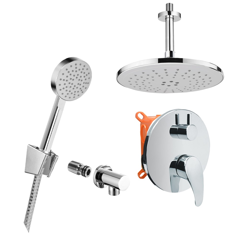 Dvoucestná podomítková baterie s keramickým přepínačem, Mbox, oválný kryt, vývod, stropní rameno, talířová sprcha ø 235 mm, držák sprchy, nerezová dvouzámková hadice 150 cm, jednopolohová ruční sprcha.10 let záruka na baterii.