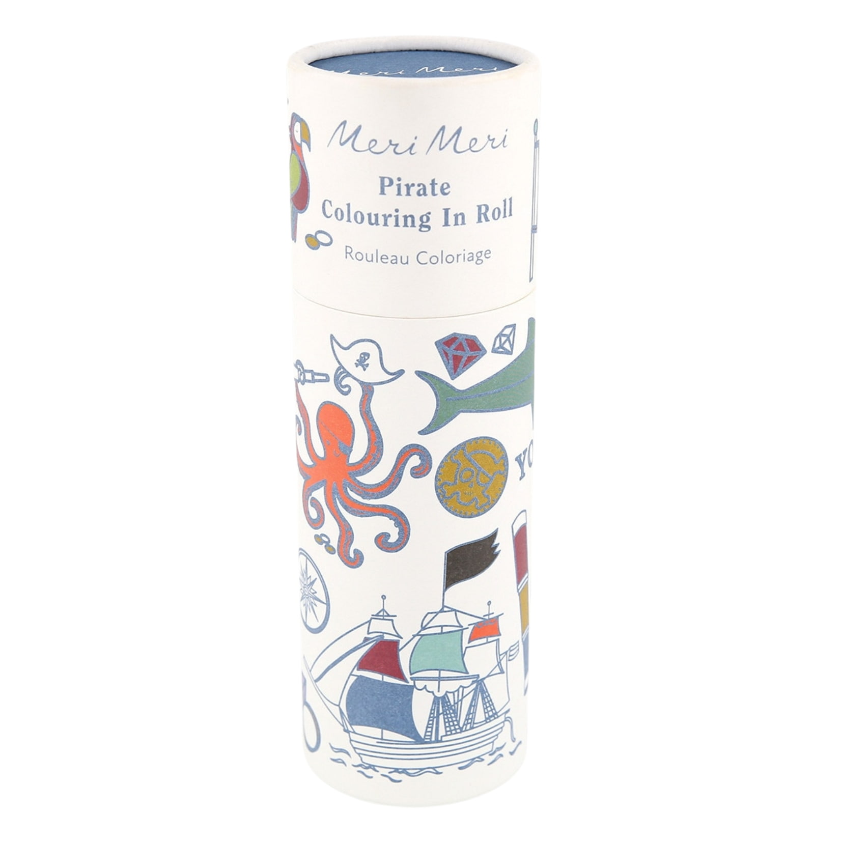 Meri Meri Omalovánky s voskovkami v tubě – Pirate, modrá barva, textil. Vyplujte na dobrodružnou cestu do světa pirátů s omalovánkovým setem od značky Meri Meri. Najdete v něm devět perforovaných částí s motivy plnými pirátských lodí, lebek, pokladů a dalších ikonických obrázků, které čekají, až dostanou život. Díky přiložené sadě pěti voskovek se mohou malí piráti pustit do tvoření hned po otevření.
