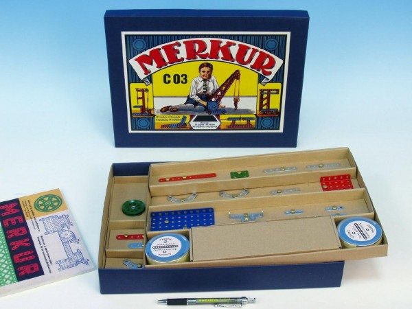 Merkur Classic C03 – jedná se o exkluzivní stavebnici balenou ve stylovém předválečném designu, která je replikou stavebnice ze začátku minulého století. Veškeré součástky jsou z tradičních materiálů a také v klasických Merkurových barvách. Ve stavebnici nenajdete žádné plastové dílky a veškeré součástky jsou uložené v papírových vložkách nebo kovových a papírových krabičkách. Součástí stavebnice MERKUR CLASSIC C03 je 94-stránková návodová knížka vyrobená ve stylu třicátých let. Tato velká návodová knížka je koncipovaná pro stavebnice MERKUR Classic C03, C04, C05. Vhodné i pro děti, které s Merkurem začínají. Se sestavenými modely si lze hrát, jsou velmi odolné. Rozměr balení: 36,5 x 27,5 x 5 cm. Věk: 6+. Nevhodné pro děti mladší 3 let.
