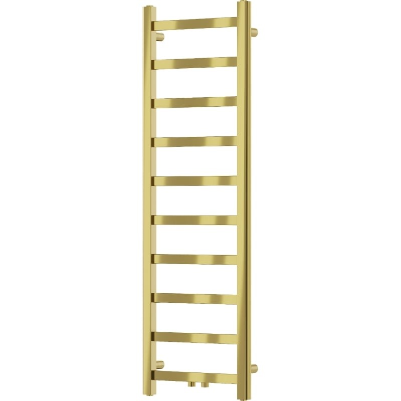Technické údaje: Výška: 1200 mm Šířka: 400 mm Hloubka: 40 mm Rozteč připojení: - 35 cm (dole) nebo 5 cm (uprostřed) Barva: Zlatá Materiál: Ocel Hmotnost: 5,99 kg Reakce na oheň: A1 Provozní teplota: max. 95 °C Maximální pracovní tlak: 0,6 MPa Topný výkon: - 75/65/20 °C - 220 W Připojení: - 2xG ½″ střed - 4xG ½″ shora a zdola na pravé nebo levé straně Možnost instalace topení Vysoce kvalitní, odolný a korozivzdorný nátěr barvy Součástí balení: zavěšení, montážní sada, záslepky a odvzdušňovací ventil
