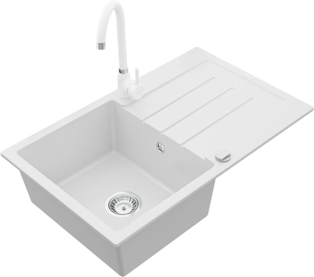 Technická data: dřez: Rozměr: 795 x 495 x 200 mm Hloubka komory: 200 mm Rozměry komory: 440x360 mm Průměr odtoku: ø90 mm Typ: 1-miska s odkapávačem Typ: Zapuštěné do pracovní desky bílá barva Povrchová úprava sifonu: Chrome Materiál: žula (80 % žulové kamenivo, 20 % pryskyřice) Přepadový otvor: Ano Otvory: (baterie, automatické) 2 Instalace: Univerzální, lze instalovat s odkapávačem na levou nebo pravou stranu Vysoká odolnost proti poškrábání a změně...