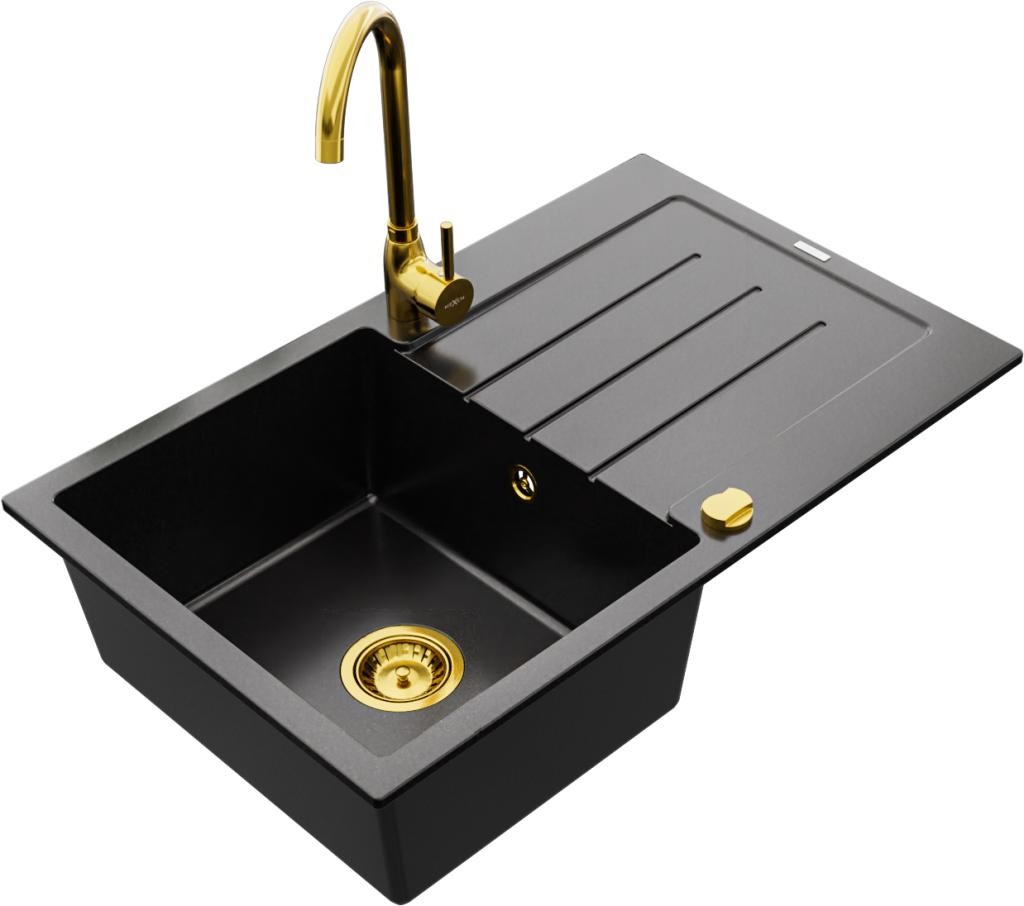MEXEN/S - Matias granitový dřez 1.5 s odkapávačem včetně baterie Flora, černá/stříbrná 6502-73-670401-70-B